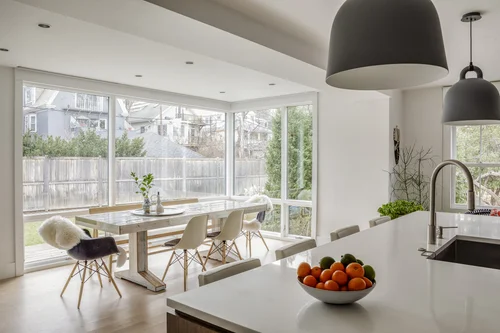 The living/dining and kitchen areas were expanded by adding an additional seven feet of living space and wall of glass spanning the entire length of the first floor. This solution created a more informal and spacious living area, as well as a visual connection to the large rear yard and gardens.